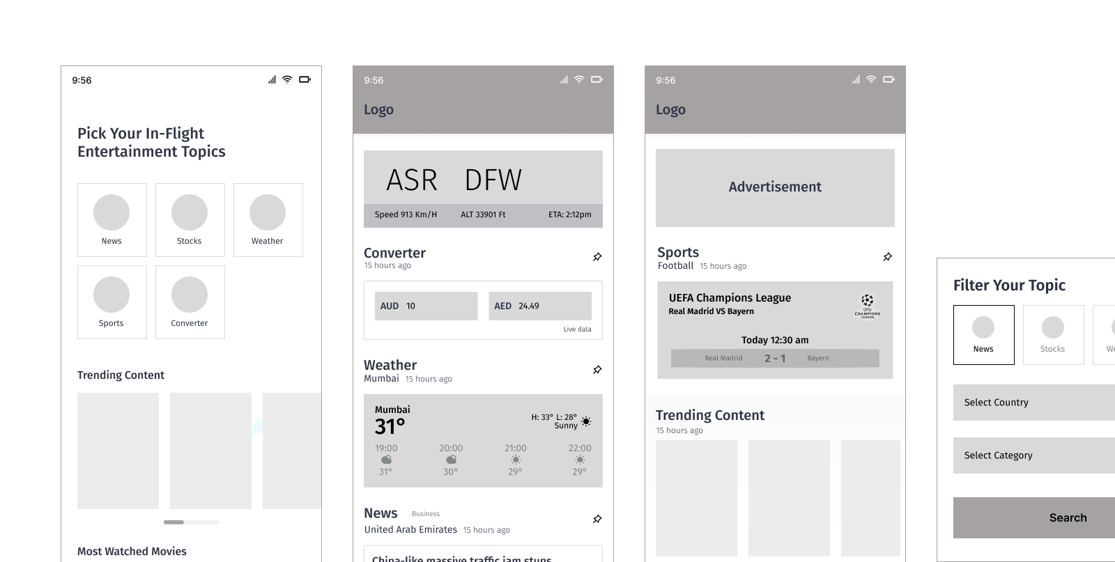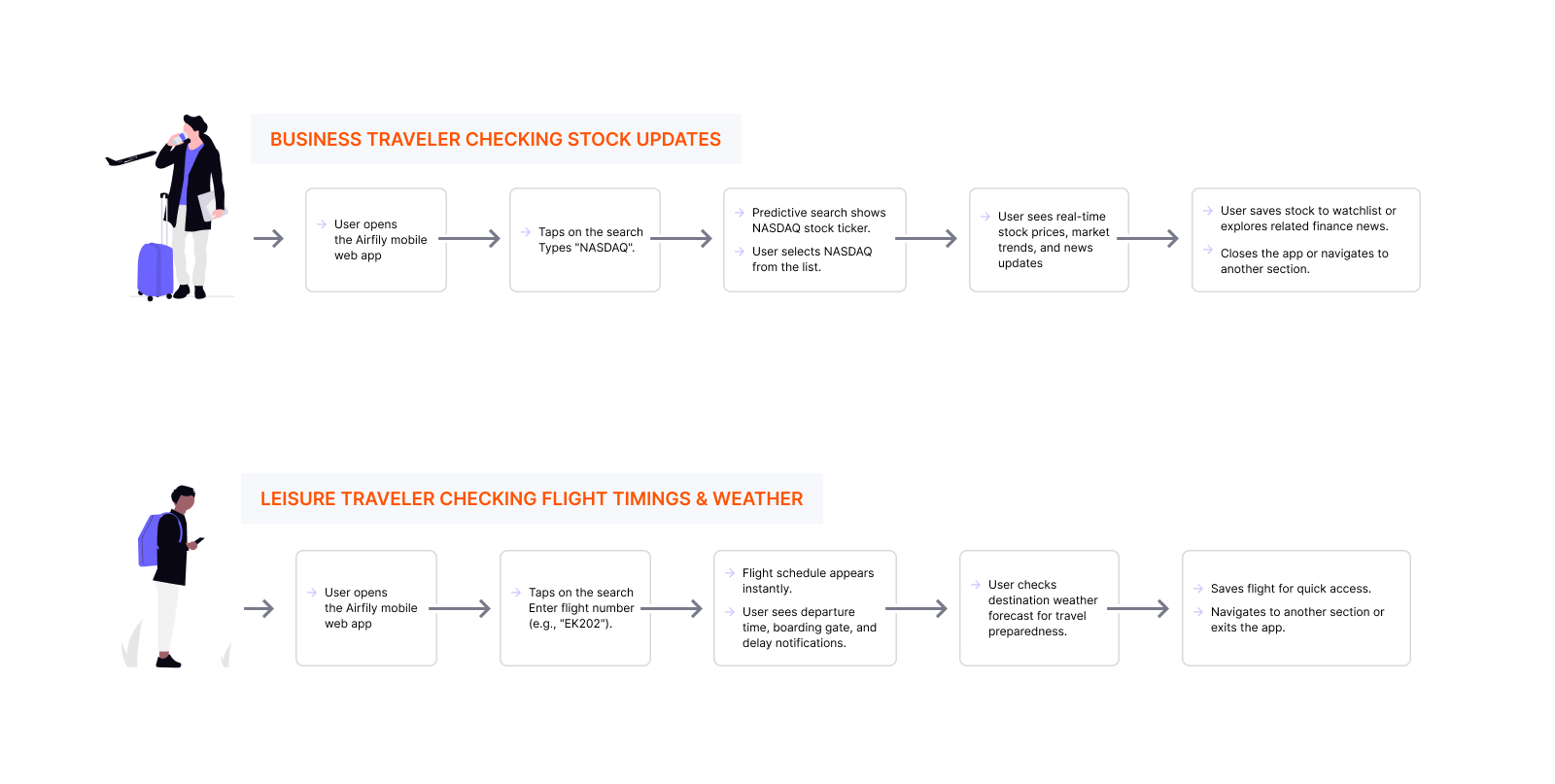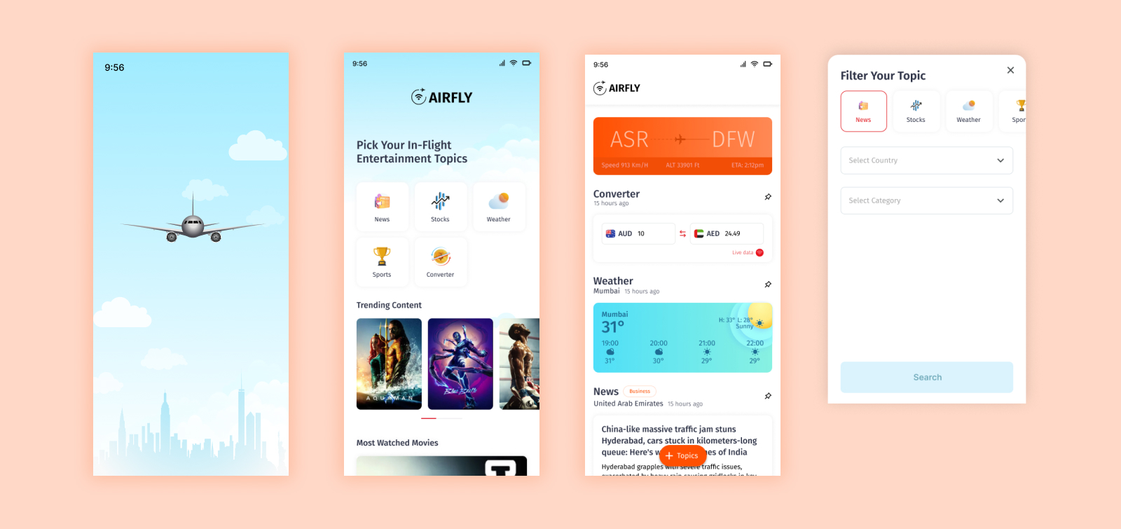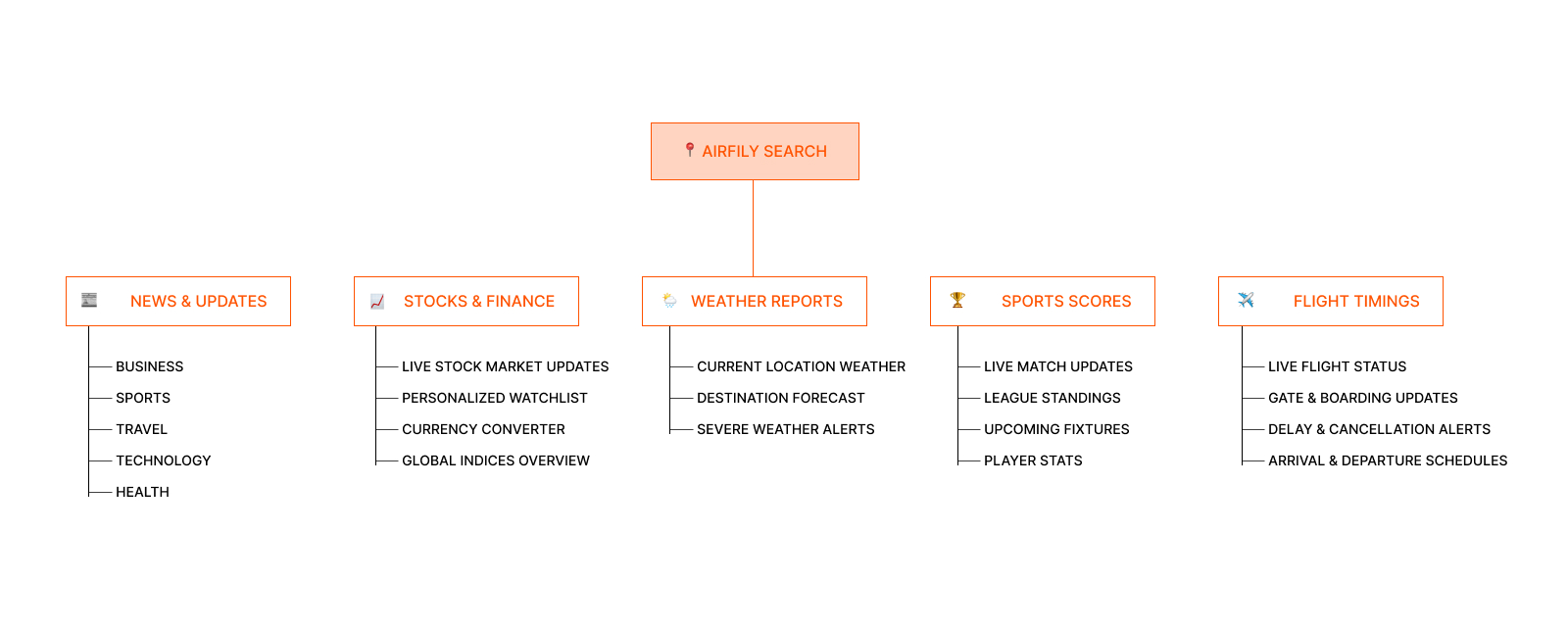 Objective: Airfily is a mobile-first, single-page web portal designed for inflight travelers. It provides quick access to topic-based searches, covering news updates, stocks, weather, sports, currency conversion, and flight timings.