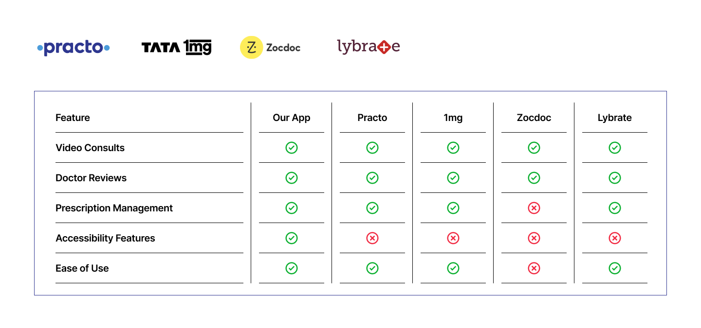 Key Differentiators: • Strong focus on accessibility. • Simplified consultation process. • Personalized health record management.