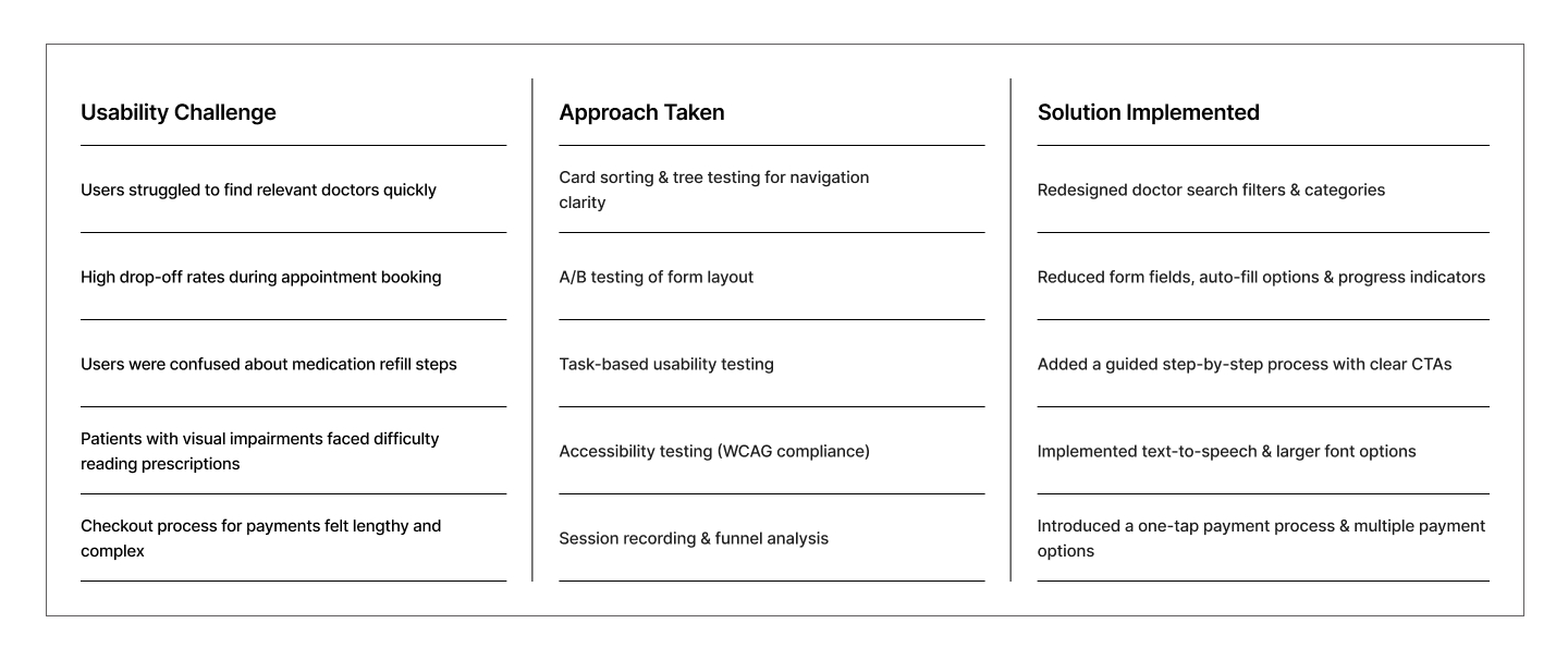 Outcome: Adjusted the placement of key features like doctor search filters and prescription refill buttons. -