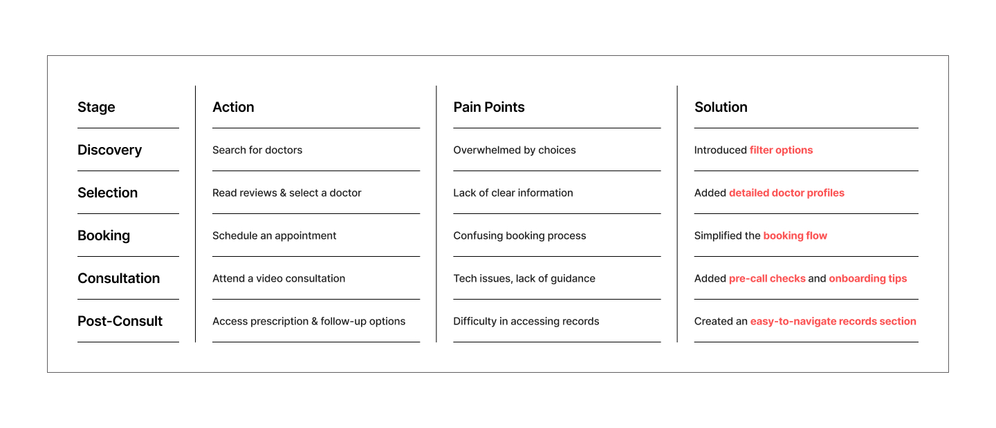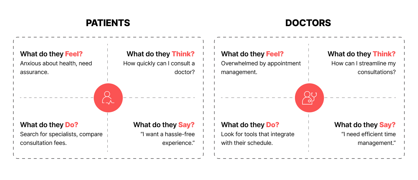 Key Insights: • Patients needed a simple, guided consultation process. • Doctors required an efficient appointment management system. • Caregivers needed easy access to patient records.