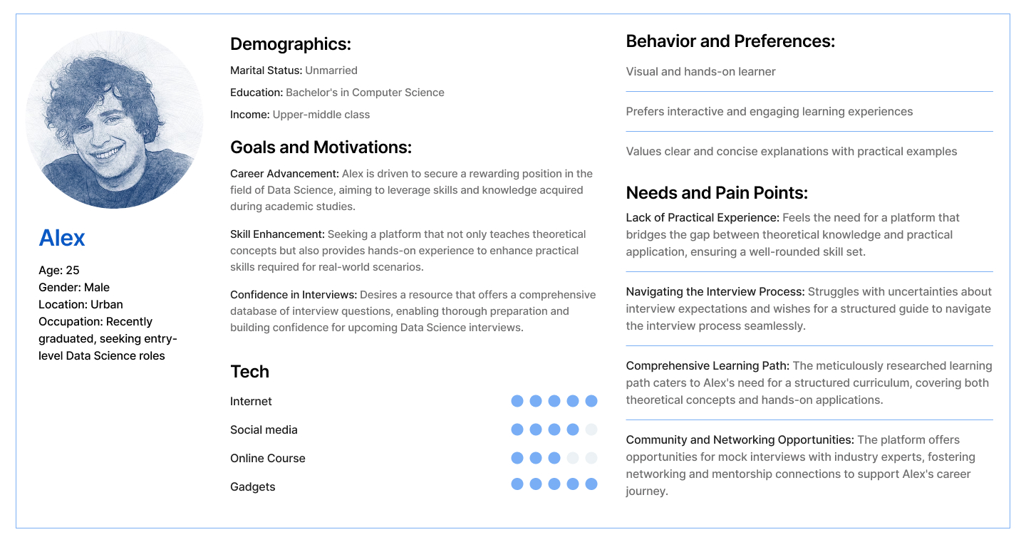 Alex, a 25-year-old recent graduate with a degree in Computer Science, is passionate about Data Science and aspires to become a Data Scientist. Facing the competitive job market, Alex realized the need for specialized interview preparation to secure a coveted position.