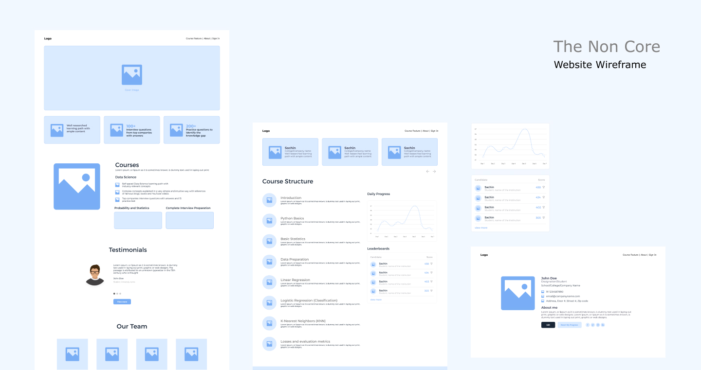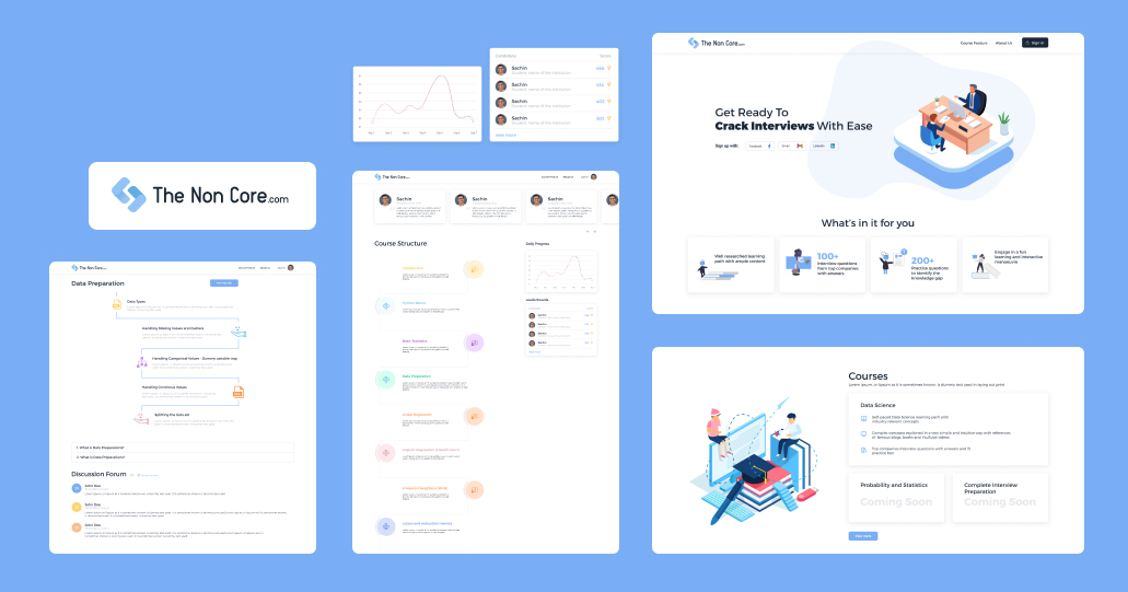 In the ideation and wireframing process, we brainstormed creative solutions to address Data Science learners' needs. Collaborating on concepts, we translated ideas into low-fidelity wireframes, focusing on user flow and key features. The iterative design phase involved feedback loops, refining wireframes for optimal usability. This methodical approach ensured a user-centric, visually intuitive interface for The Non Core platform, seamlessly blending theory and hands-on practice to empower learners in their Data Science interview preparation journey.