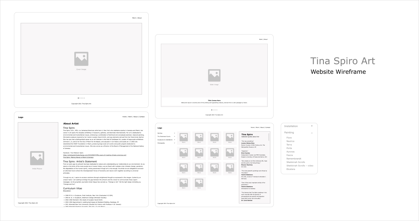 The iterative testing and feedback process for Tina Spiro's portfolio website involved several key stages. Initially, a design prototype was created based on a wireframe, encompassing elements such as navigation, thematic collections, an about section, and contact information. Usability testing was conducted with a diverse group, including art enthusiasts and potential clients. Feedback, gathered through surveys, interviews, and observation, focused on user experience, visual appeal, and navigation. This input informed the first round of iterative design updates, addressing identified issues and refining aspects of the website.