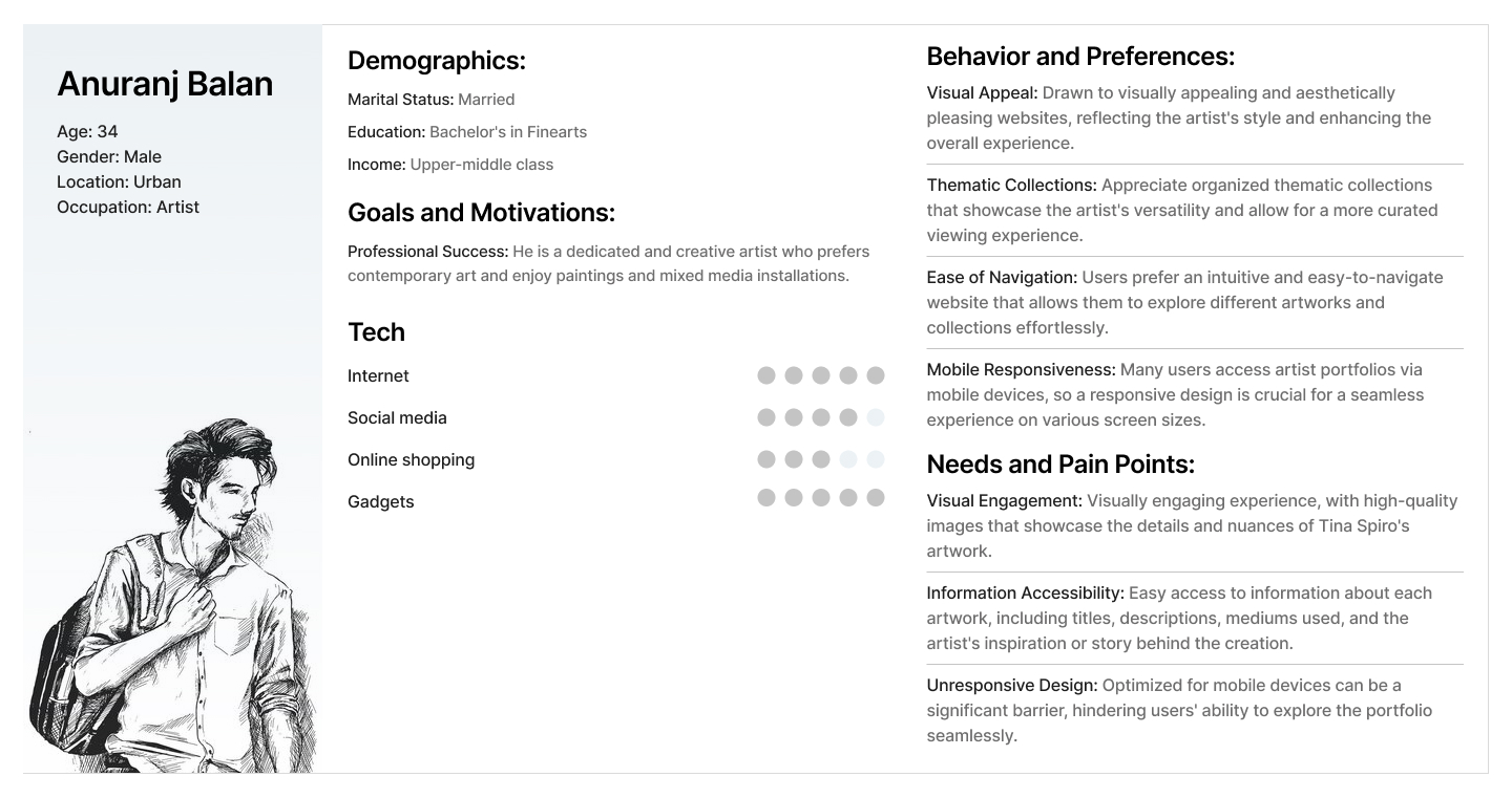 To understand user preferences and enhance Tina Spiro's portfolio website, user research involves surveys and interviews with her target audience, art enthusiasts, and potential clients. Observing user interactions on existing art platforms aids in identifying preferences. Additionally, analyzing competitor websites offers insights. Iterative feedback loops with Tina Spiro and potential users guide the design process. Qualitative data ensures a user-centric approach, resulting in a tailored portfolio site that resonates with the audience and meets Tina's artistic and professional goals.User Personas